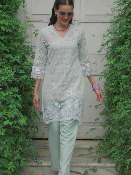 Tailored in breathable schiffli embroidered cotton, this V-neck co-ord set features delicate floral surface ornamentation for a graceful look. The hem and sleeves are finished with organza schiffli lace, adding a touch of elegance and texture. A perfect choice for daytime gatherings, summer outings, or effortless festive dressing.
