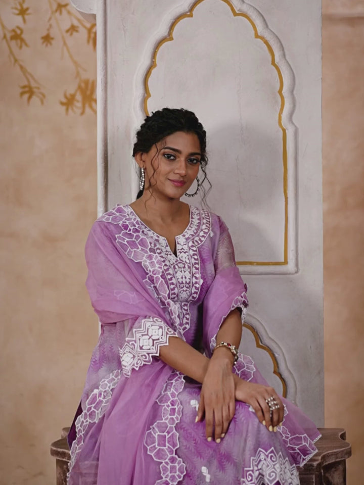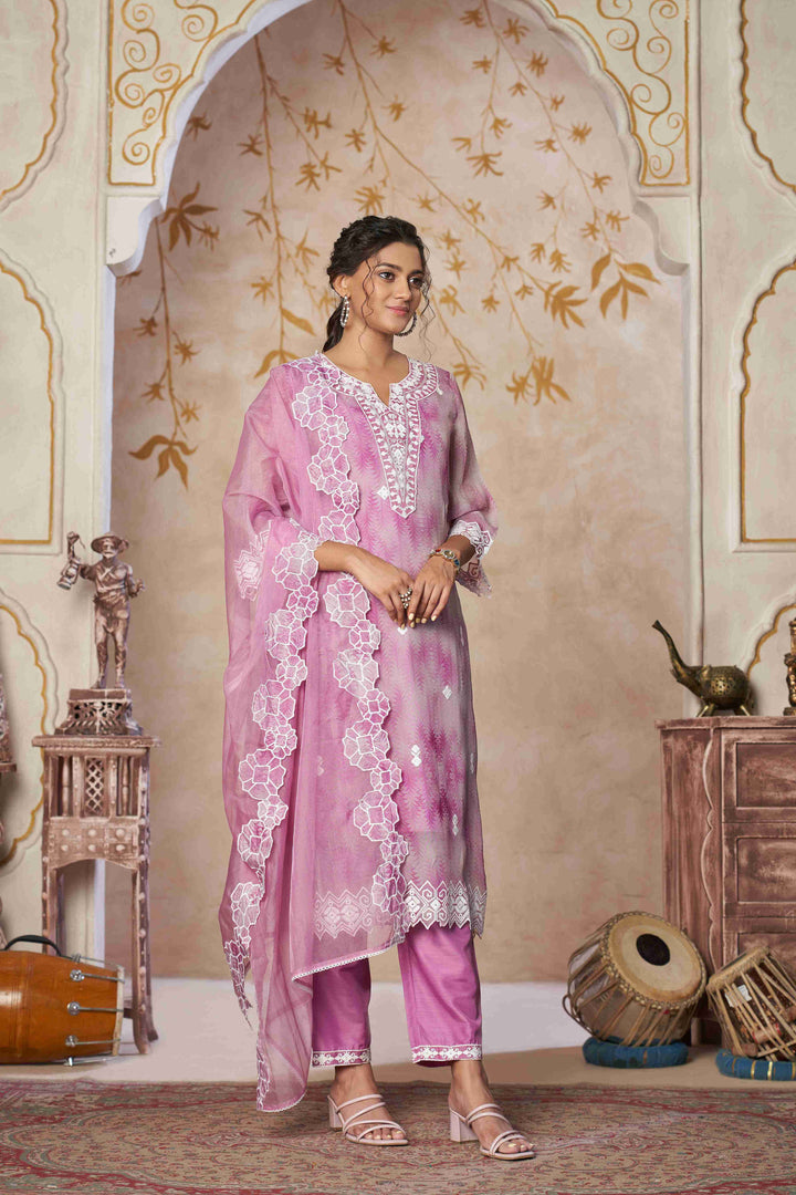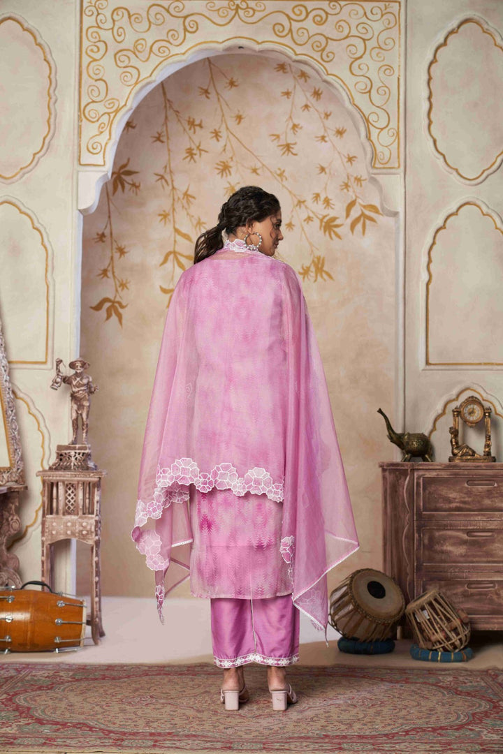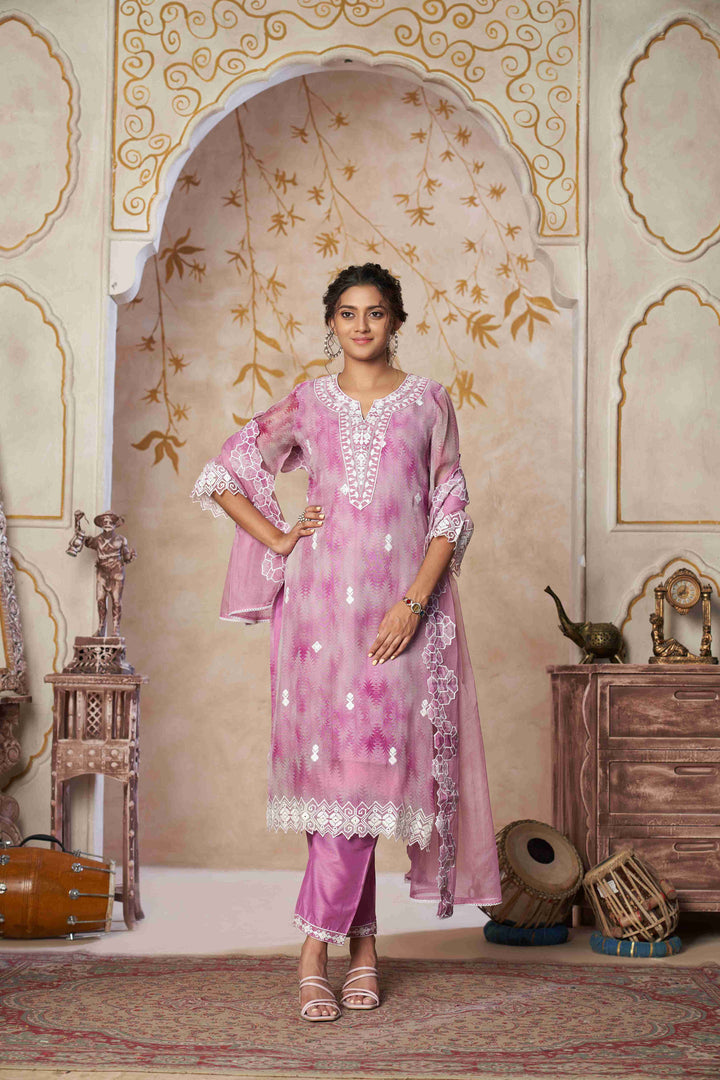 This graceful georgette suit set in soothing pink showcases intricate schiffli embroidery for a timeless and elegant appeal. The kurta features delicate lace and threadwork on the neckline, sleeves, and hemline, highlighted with floral motifs for a refined finish. Paired with straight-fit trousers and a sheer organza dupatta adorned with matching embroidery, this set blends comfort with sophistication—perfect for festive occasions, family gatherings, or elegant everyday wear.