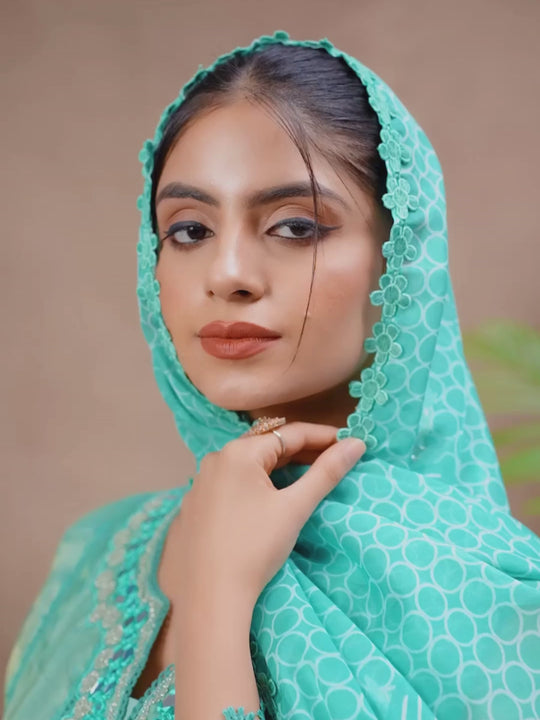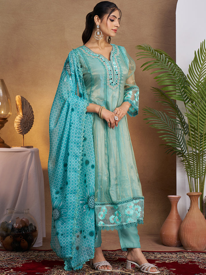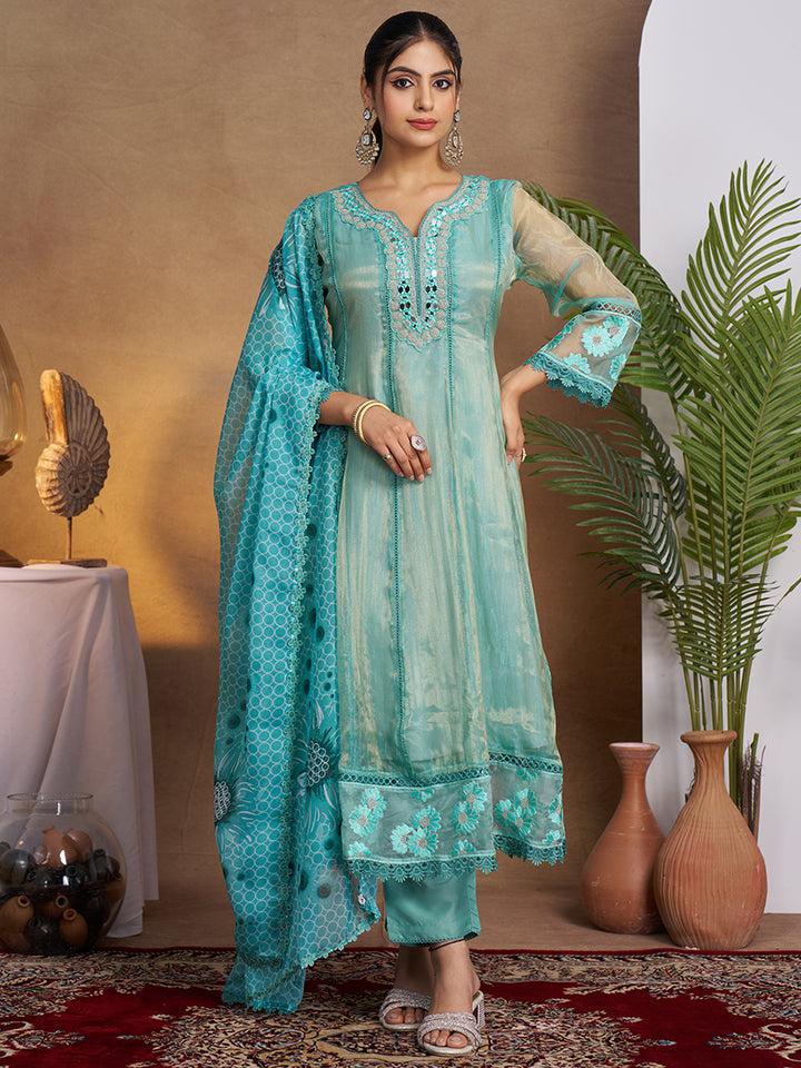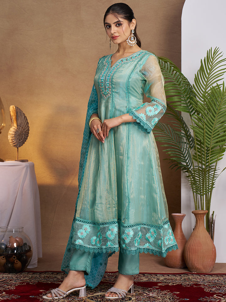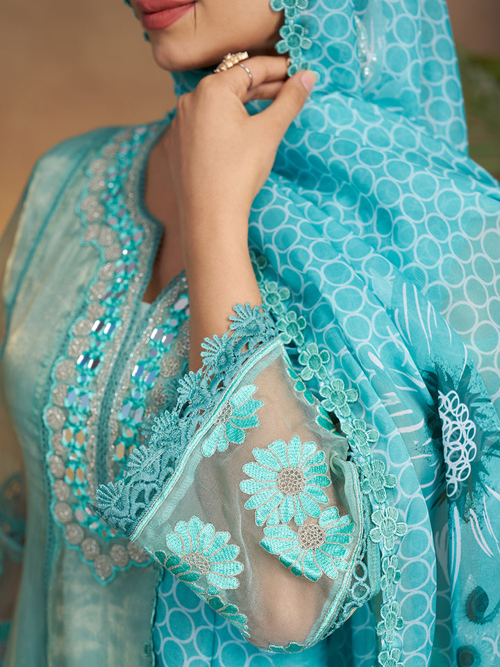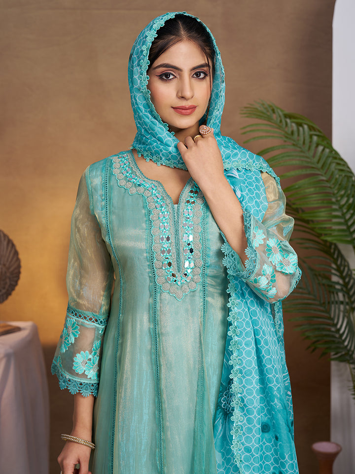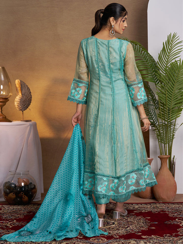 Teal Organza Embroidered Anarkali Kurta Set with Floral Printed Dupatta