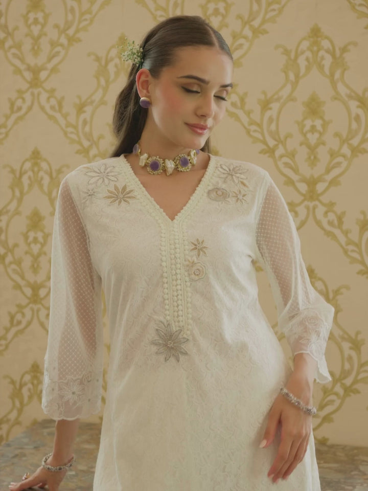 A perfect mix of texture and detail, this co-ord set is crafted in raschel knitted fabric with an all-over floral pattern. Small embroidered floral motifs add just the right touch of charm and finesse. Designed for ease and elegance, it’s your go-to choice for daytime plans or intimate celebrations.