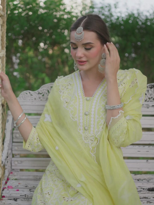 Yellow Cotton Schiffli Embroidered Kurta Set with Organza Dupatta