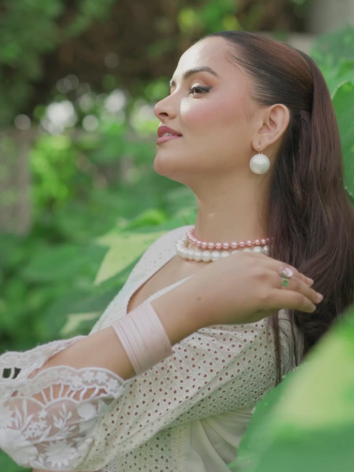 Tailored in breathable schiffli embroidered cotton, this V-neck co-ord set features delicate floral surface ornamentation for a graceful look. The hem and sleeves are finished with organza schiffli lace, adding a touch of elegance and texture. A perfect choice for daytime gatherings, summer outings, or effortless festive dressing.